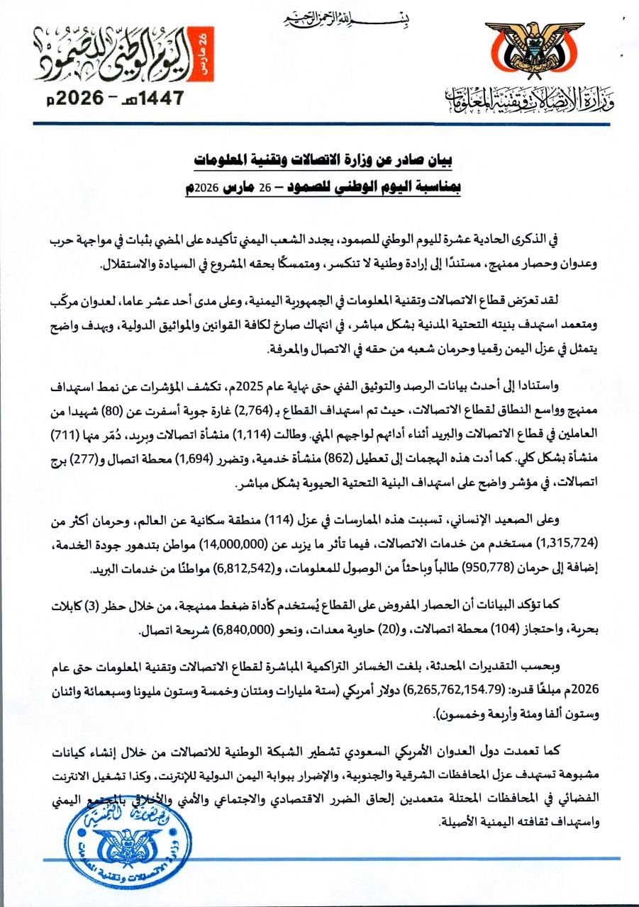 بيان صادر عن وزارة الاتصالات وتقنية المعلومات بمناسبة اليوم الوطني للصمود – 26 مارس 2026م في الذكرى الحادية عشرةلليوم ال....