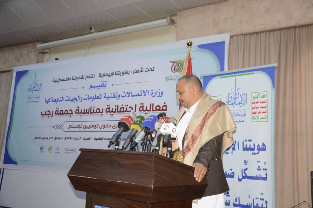 نظمّت وزارة الاتصالات وتقنية المعلومات والجهات التابعة لها اليوم، فعالية خطابية بعيد جمعة رجب - ذكرى دخول اليمنيين الإسلام تحت شعار "بهويتنا الإيمانية .. ننتصر لقضيتنا الفلسطينية".